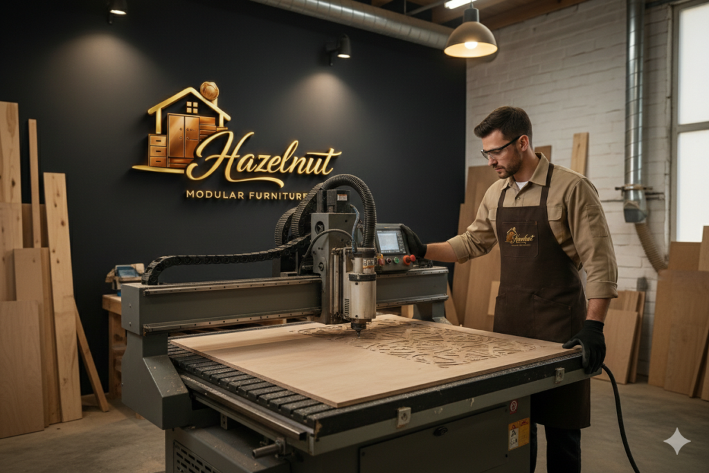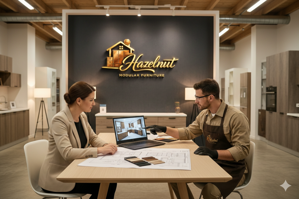 At Hazelnut Modular, we craft luxury modular furniture designed for modern living. With our own factory and expert team, we deliver beautifully designed kitchens, wardrobes, and storage solutions that combine style with functionality.